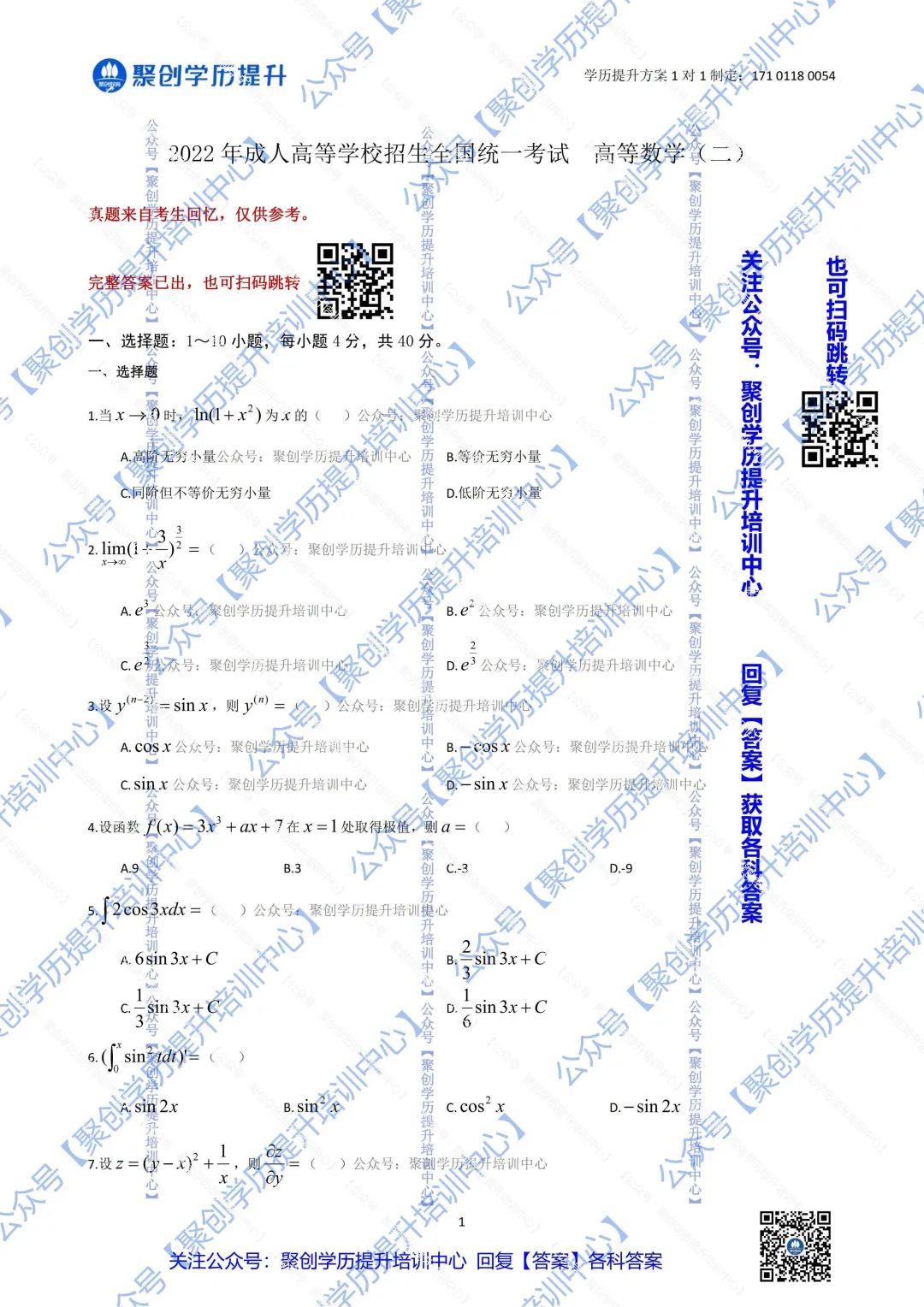 2022成考答案丨高数一、高数二答案-尊龙凯时人生就是搏